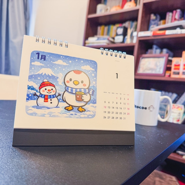 hitocoeカレンダー2026がついに登場! B6サイズの卓上リング綴じカレンダーです。 表紙・2026年1月〜12月まで・年まとめカレンダーの計14枚。 hitocoeキャラクターの「つるのくん」が、毎月のイベントを楽しむ装いでみなさんの生活に季節感を与えます。